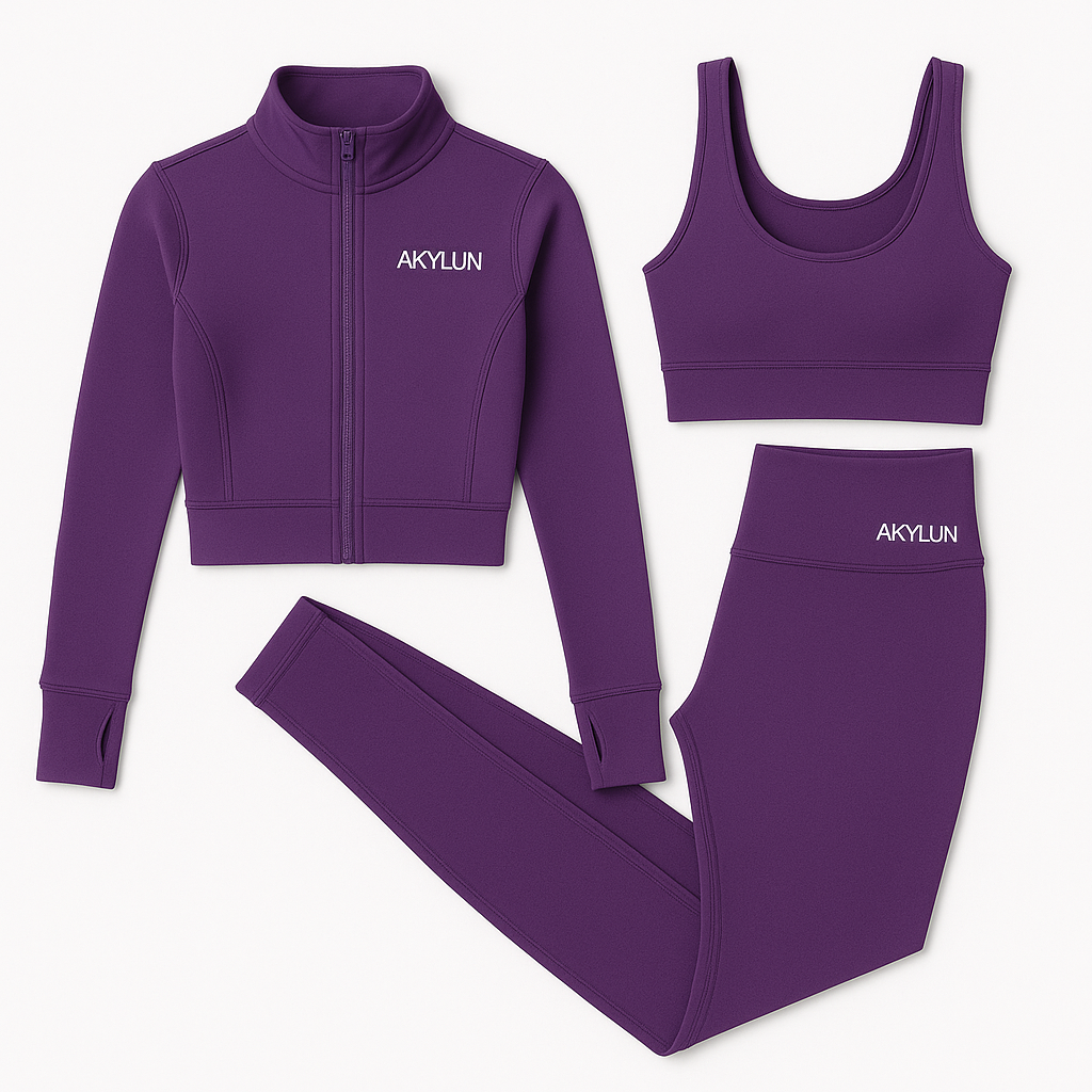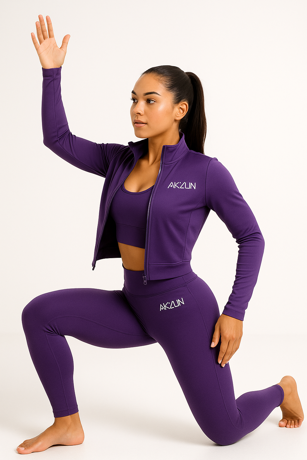 Elevate your presence with Plum Radiance, the boldest bloom in the Akylun Bloom Collection. This striking three-piece set features a deep plum hue that commands attention and inspires confidence. Designed with a zip-up jacket (featuring thumbhole cuffs), a supportive non-zip sports bra, and sculpting high-waisted leggings, this set moves with you through every stretch and stride. Built to support your strength and show off your radiance—inside and out.